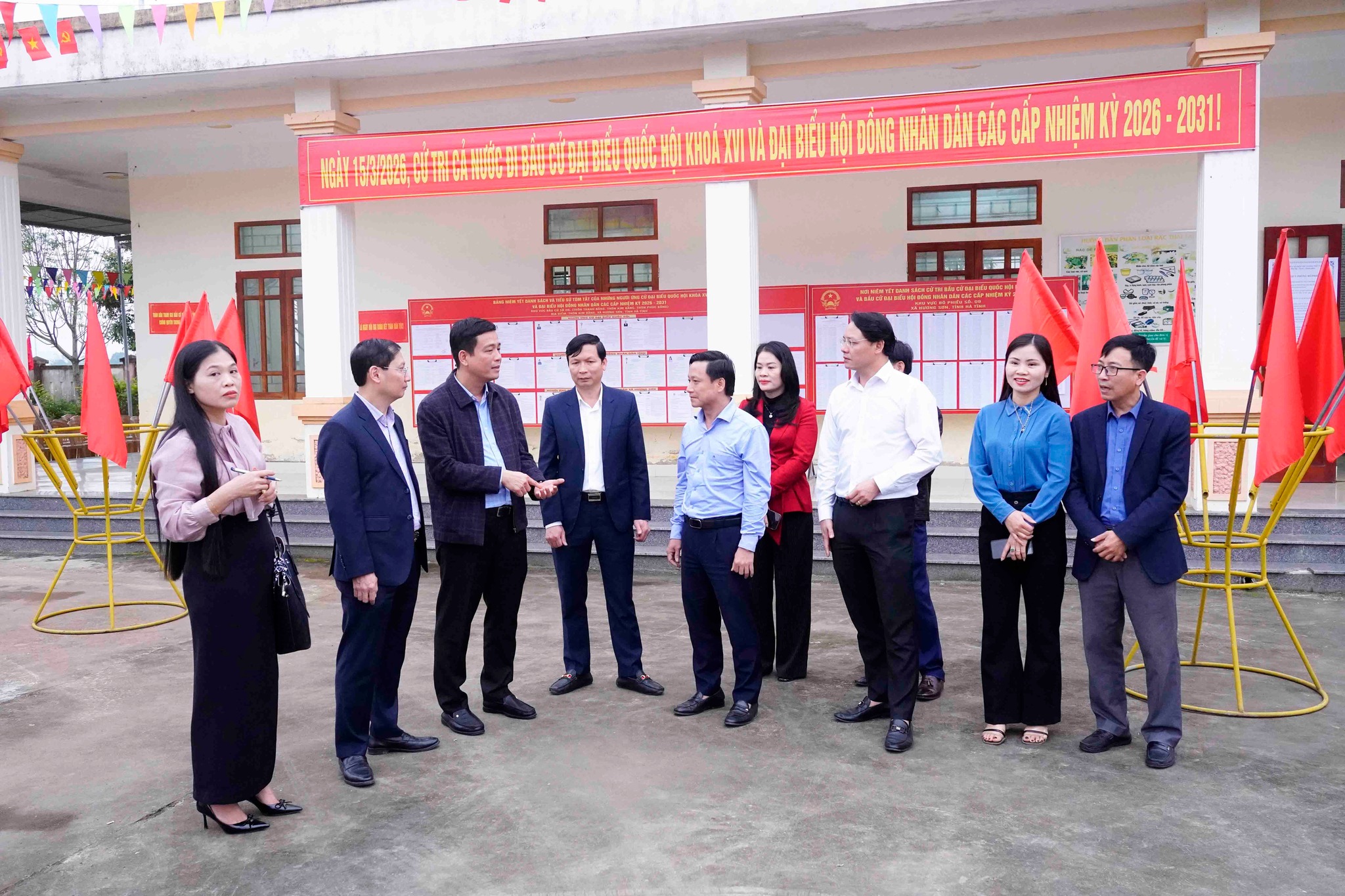 Đoàn đã trực tiếp kiểm tra về niêm yết danh sách, tiểu sử tóm tắt những người ứng cử đại biểu Quốc hội khóa XVI và đại biểu Hội đồng nhân dân các cấp nhiệm kỳ 2026-2031; danh sách cử tri; công tác trang trí khánh tiết ngoài và trong khu vực bỏ phiếu; Công tác bảm đảm an ninh, trật tự, an toàn xã hội; phòng chống cháy nổ; trang thiết bị cơ sở vật chất chuẩn bị cho ngày bầu cử vv...