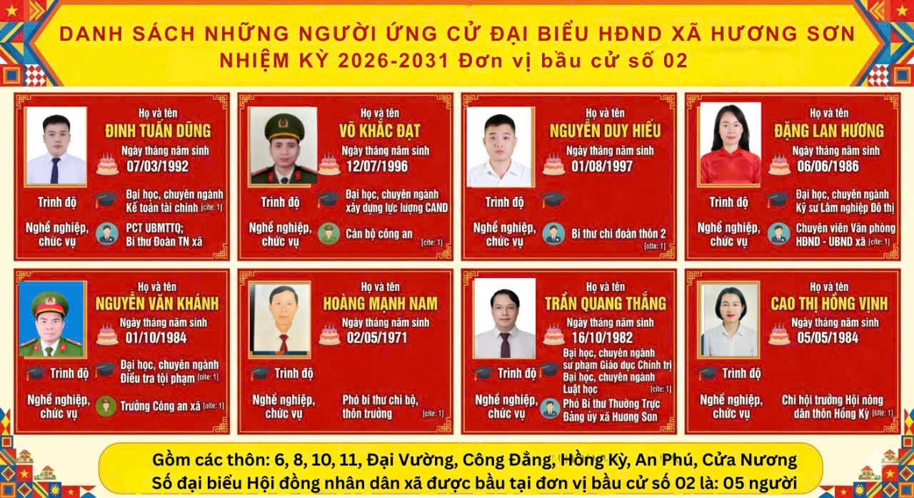 Ủy ban Bầu cử xã Hương Sơn trân trọng giới thiệu Danh sách 35 người ứng cử đại biểu HĐND xã Hương Sơn khóa II, nhiệm kỳ 2026-2031, tại 5 Đơn vị bầu cử.