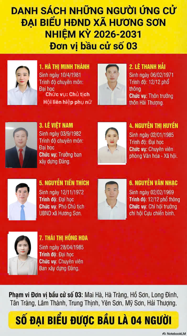 Danh sách 35 người ứng cử đại biểu HĐND xã Hương Sơn khóa II, nhiệm kỳ 2026-2031, tại 5 Đơn vị bầu cử.