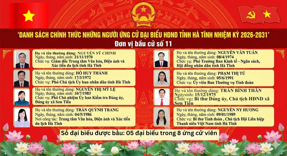 Danh sách 8 ứng cử viên để bầu 5 đại biểu HĐND tỉnh Hà Tĩnh khóa XIX tại Đơn vị bầu cử số 11.
