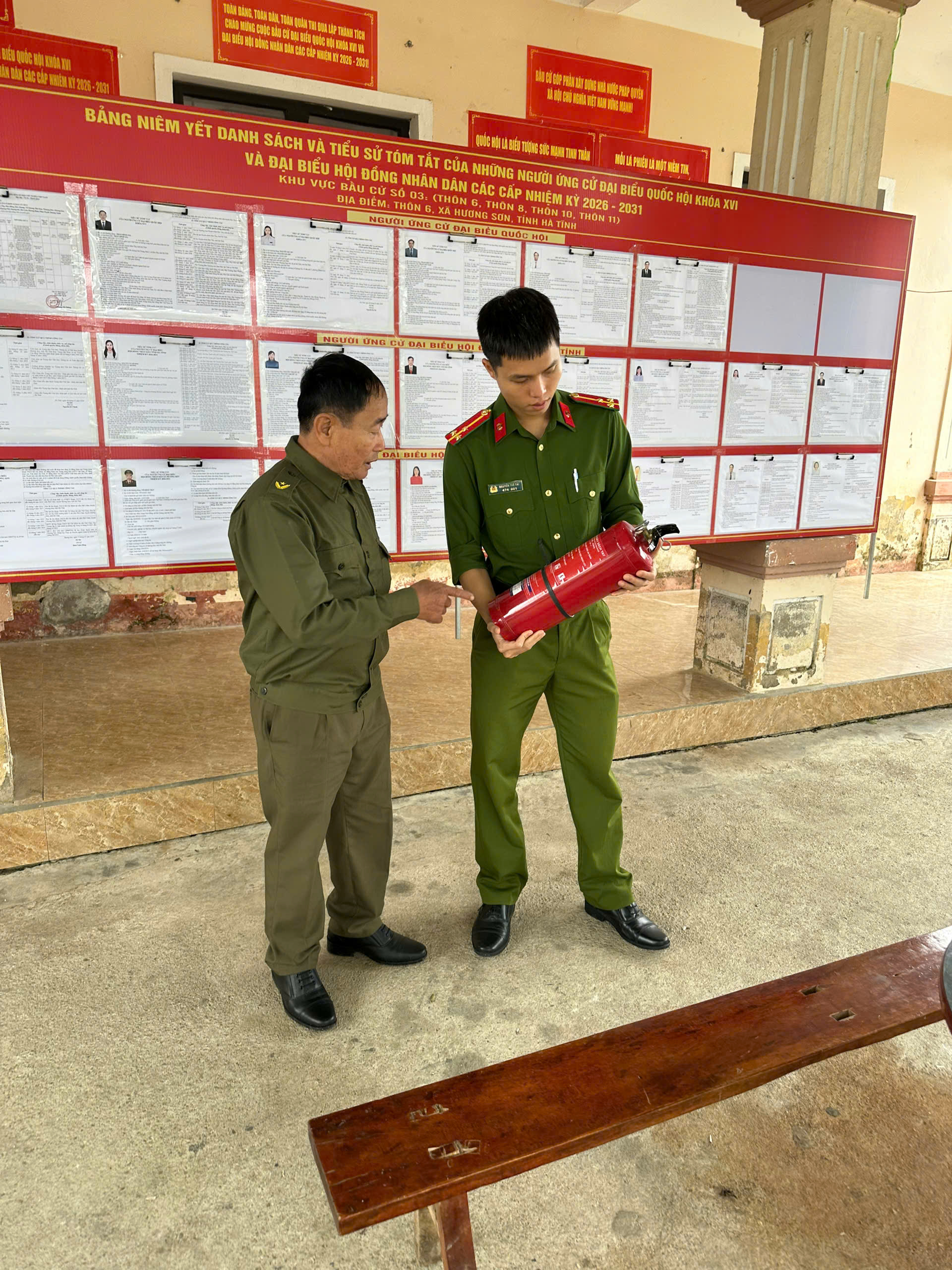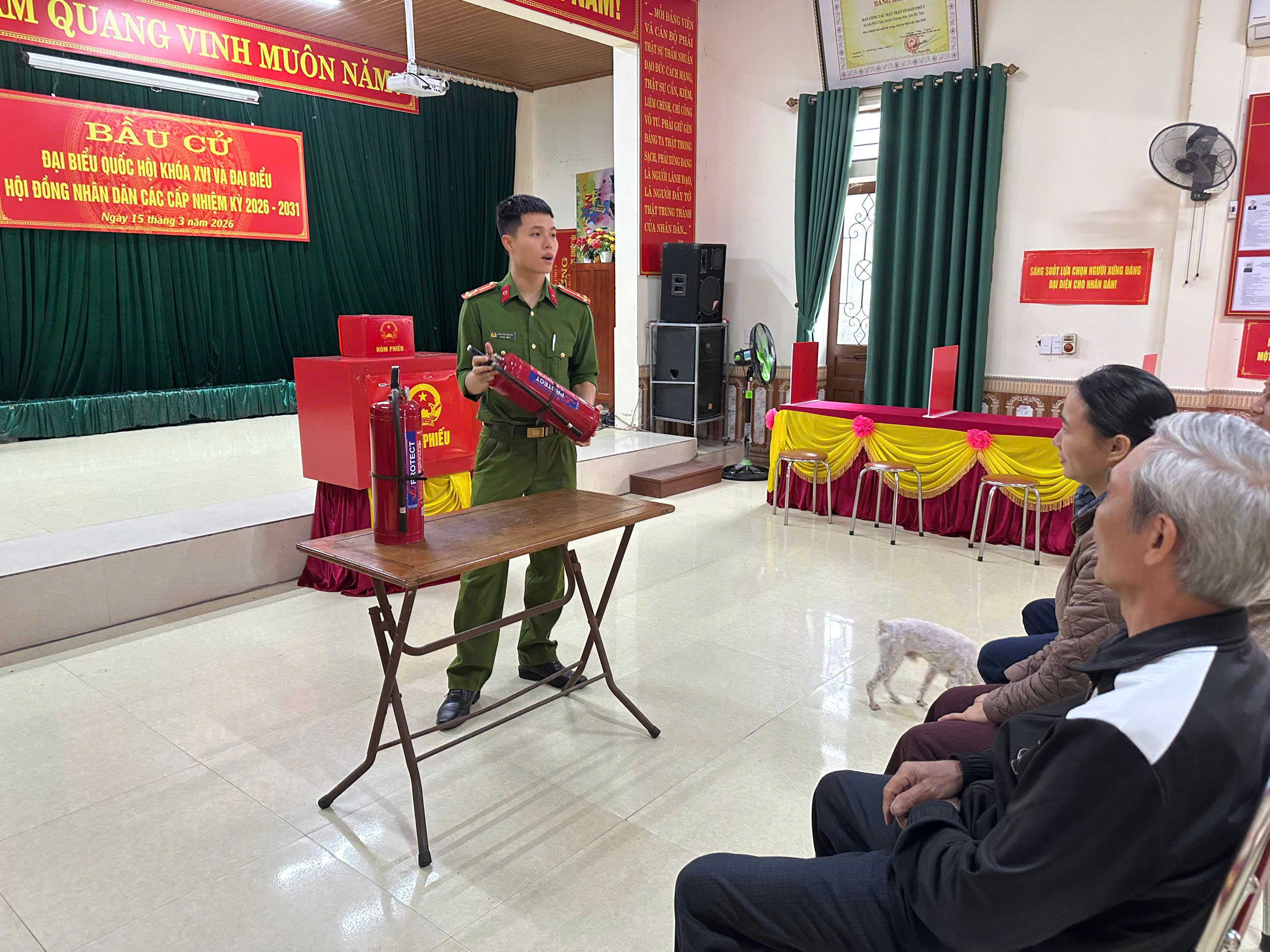 Bên cạnh đó, lực lượng Đội CC và CNCH khu vực Hương Sơn cùng Công an xã đã trực tiếp tuyên truyền, phổ biến kiến thức, kỹ năng phòng cháy, chữa cháy cho cán bộ phục vụ bầu cử và người dân tham gia bỏ phiếu; hướng dẫn cách sử dụng bình chữa cháy xách tay, kỹ năng xử lý khi phát hiện cháy, nổ; đồng thời nhắc nhở việc sử dụng điện an toàn, không câu mắc điện tùy tiện, không thắp hương hoặc đốt vàng mã trong khu vực bỏ phiếu.