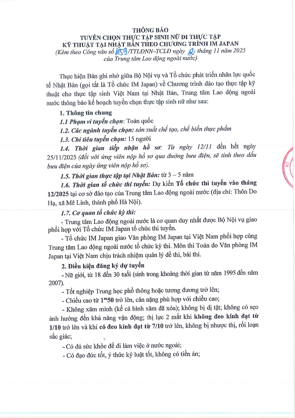 THÔNG BÁO TUYỂN CHỌN THỰC TẬP SINH NỮ ĐI THỰC TÂPJ KỸ THUẬT TẠI NHẬT BẢNBBT20/11/2025A -A+BBT20/11/2025A -A+