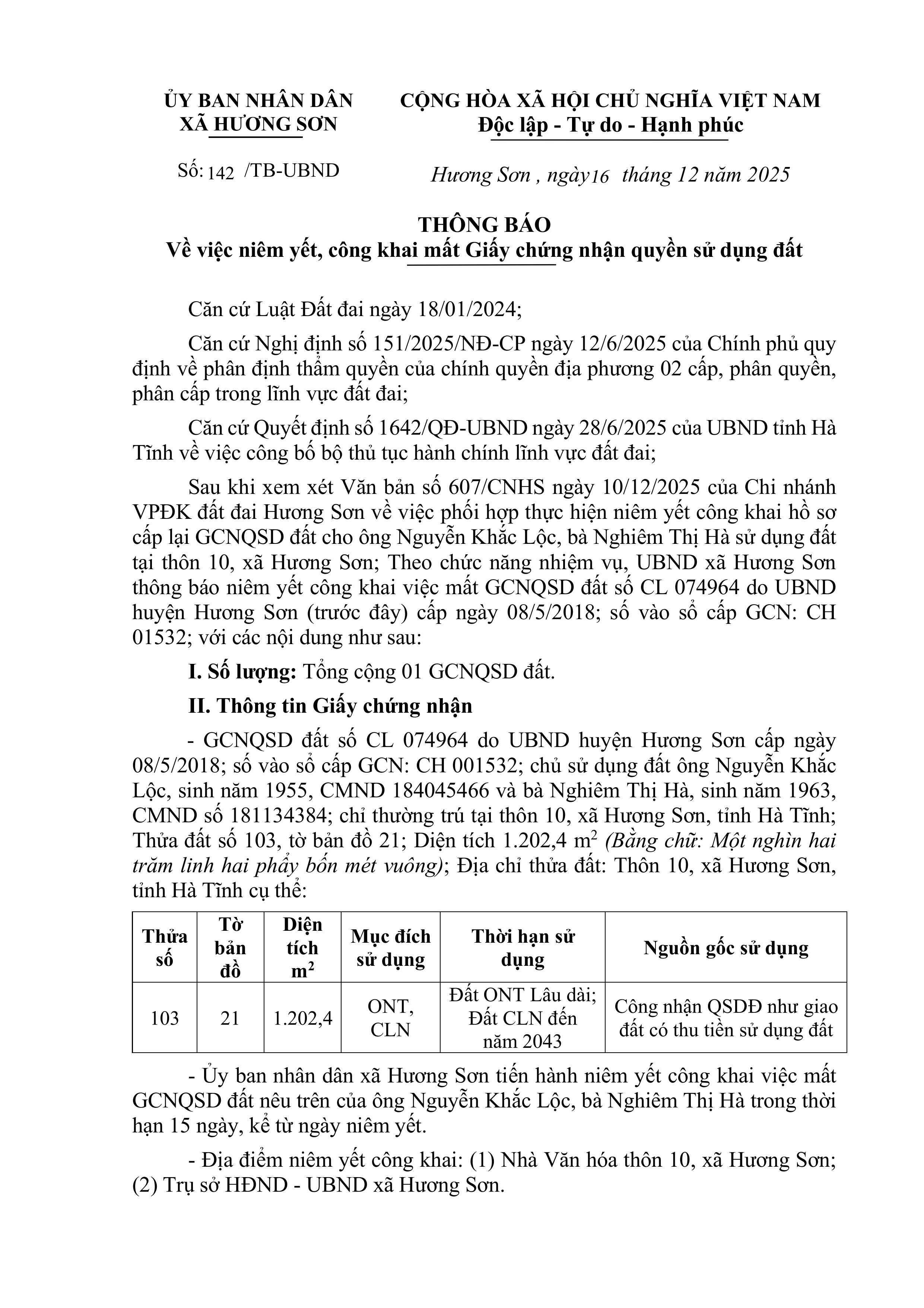 THÔNG BÁO Về việc niêm yết, công khai mất Giấy chứng nhận quyền sử dụng đấtUBND16/12/2025A -A+UBND16/12/2025A -A+