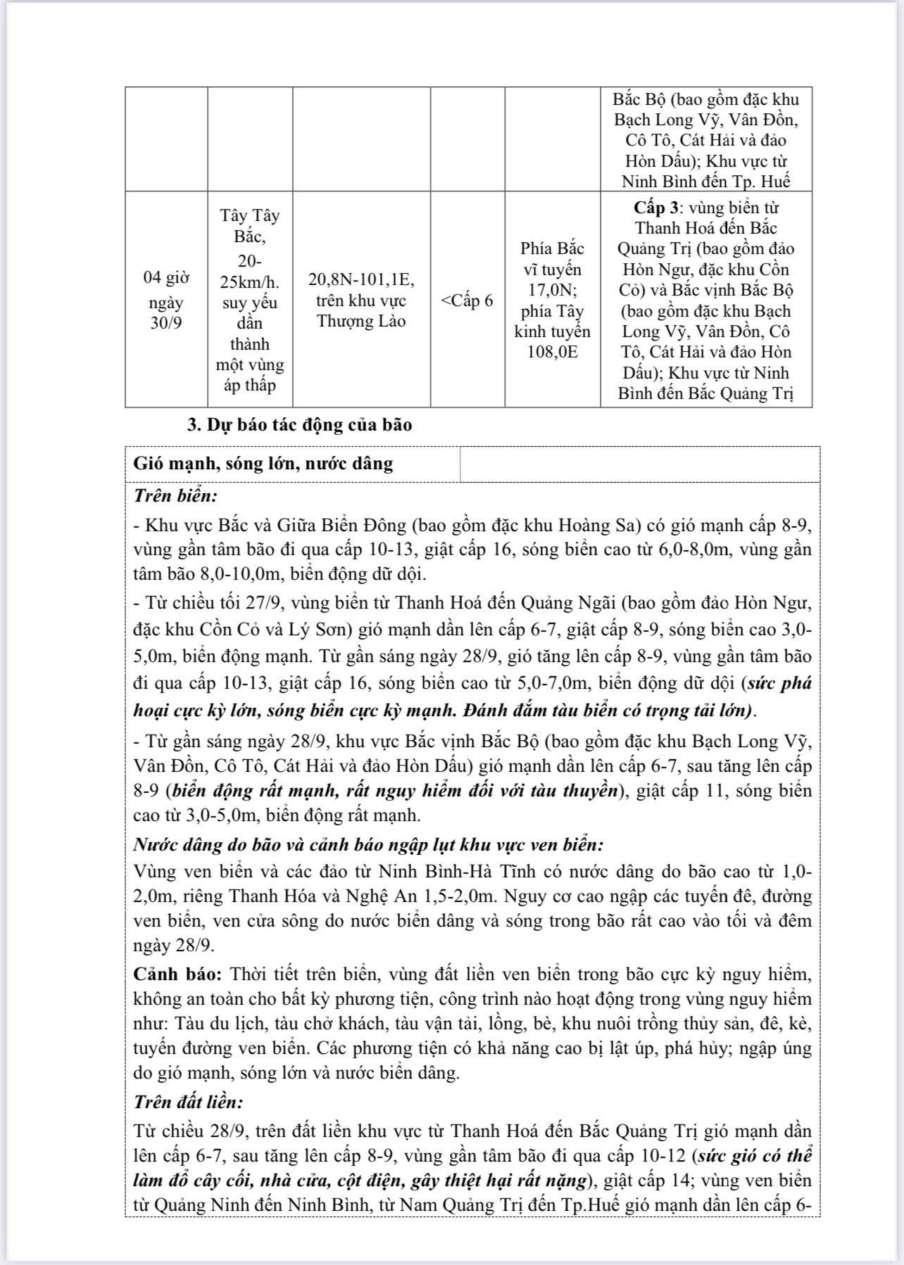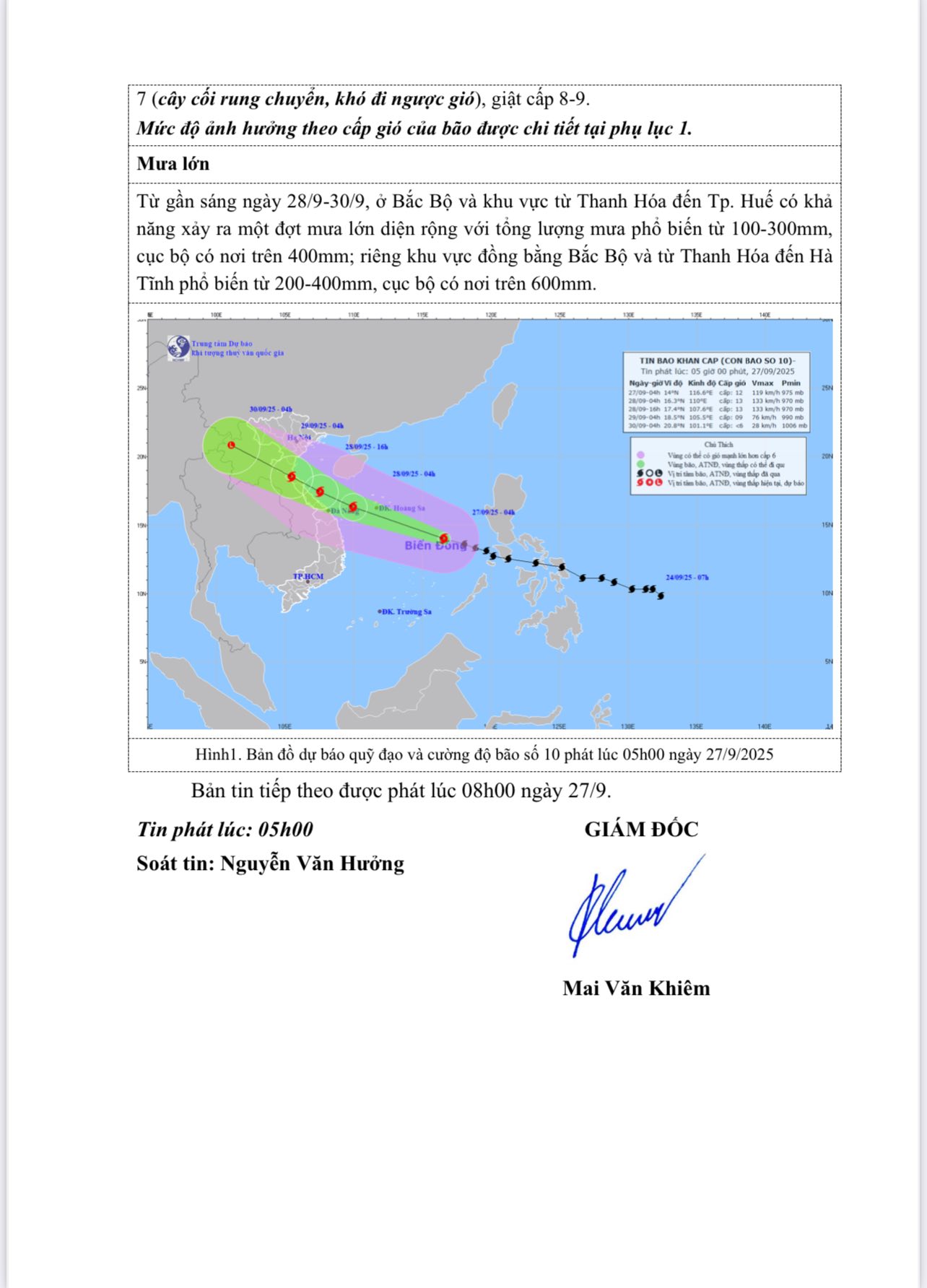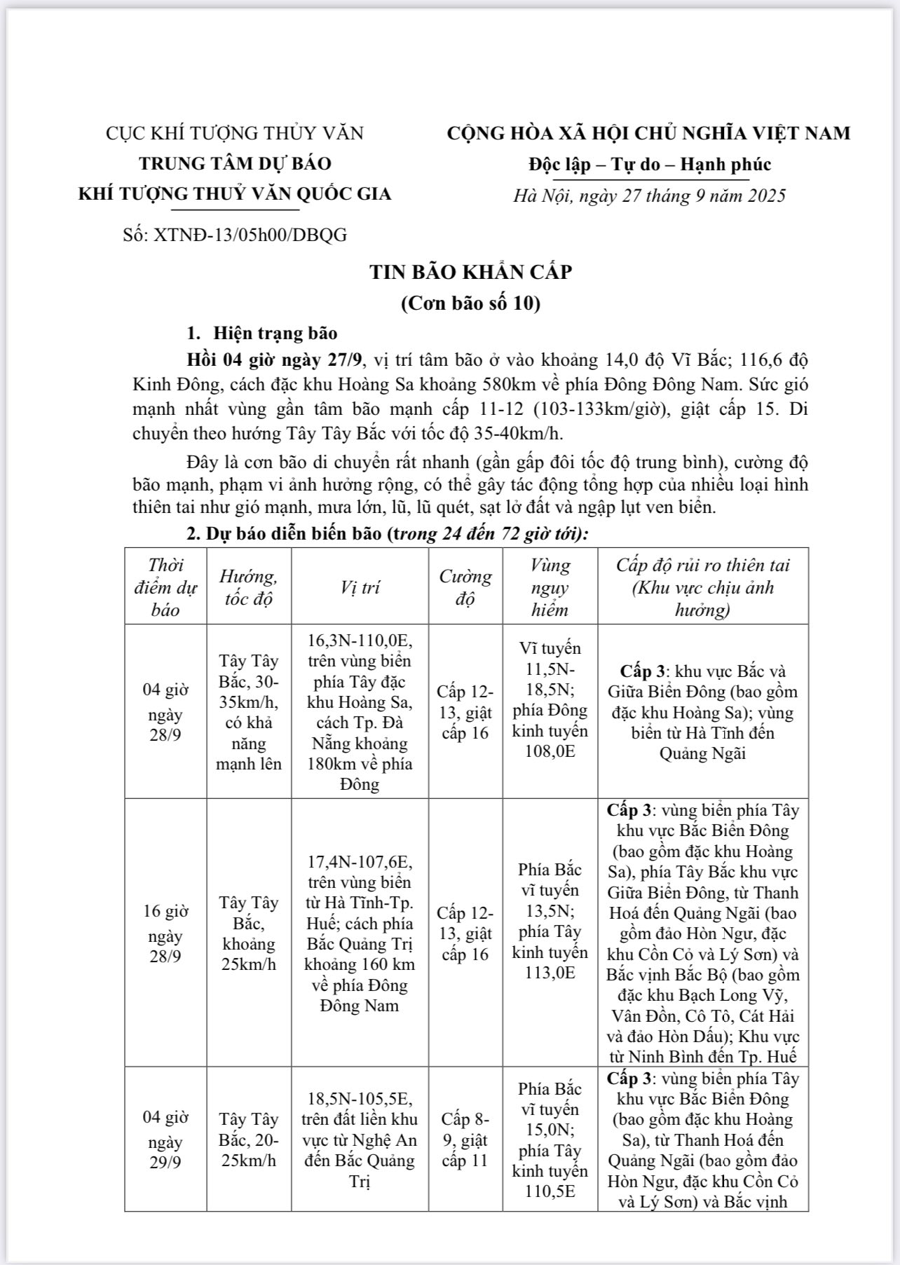 TIN BÃO KHẨN CẤP (CƠN BÃO SỐ 10)XT27/09/2025A -A+XT27/09/2025A -A+Trung tâm dự báo khí tượng thủy văn Quốc gia Thông báo: