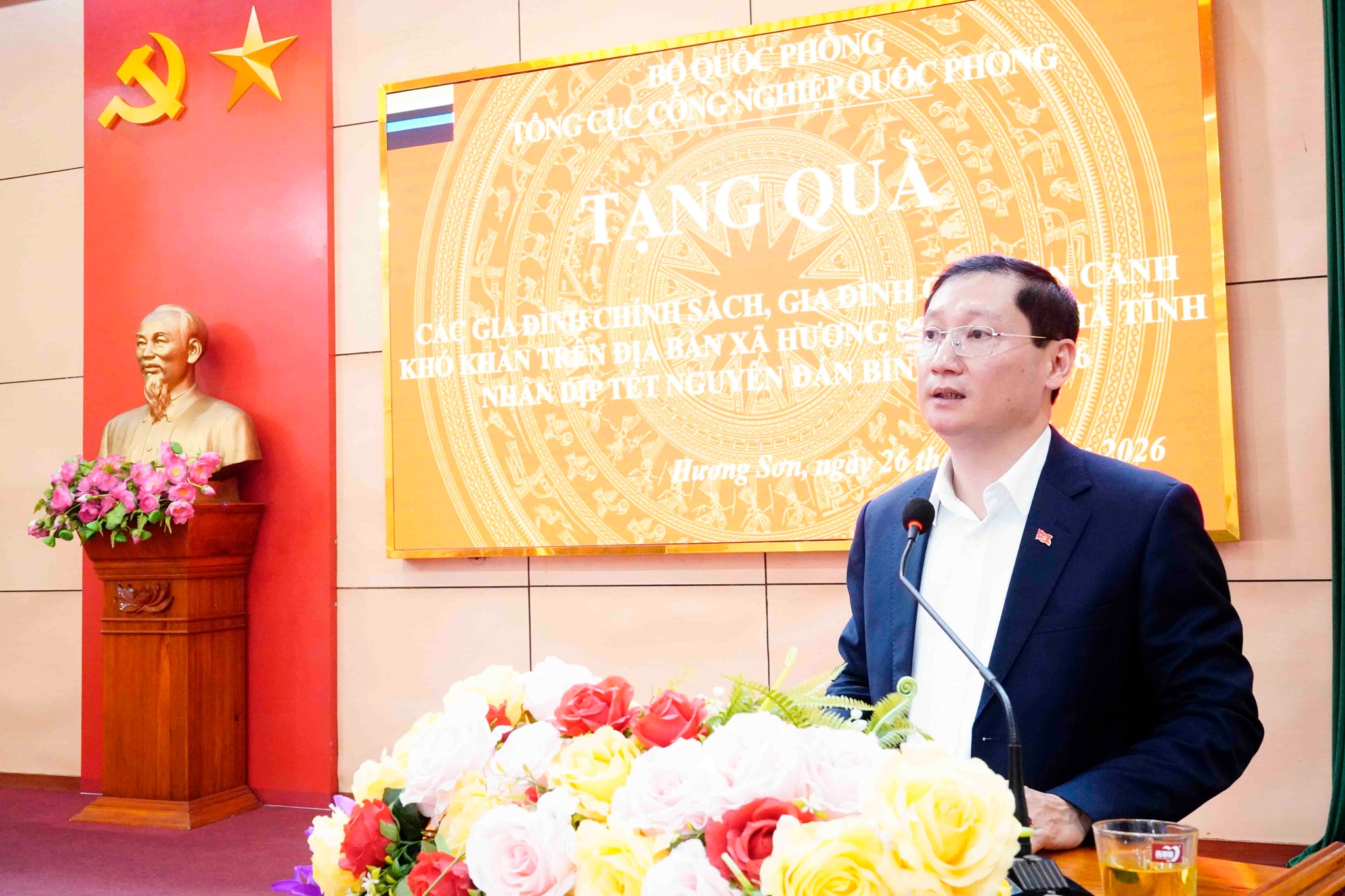 Thay mặt Đảng bộ, chính quyền và nhân dân xã Hương Sơn, đồng chí Lương Quốc Tuấn - TUV, Bí thư Đảng ủy, Chủ tịch HĐND xã Hương Sơn trân trọng cảm ơn sự quan tâm của lãnh đạo, chỉ huy Tổng cục Công nghiệp quốc phòng đối với Đảng ủy, Ủy ban nhân dân và các đối tượng chính sách, hộ gặp hoàn cảnh khó khăn trên địa bàn xã Hương Sơn, góp phần động viên các gia đình vươn lên trong cuộc sống, đón Tết cổ truyền trong không khí vui tươi, đầm ấm. Đồng chí Bí thư Đảng ủy, Chủ tịch HĐND xã Lương Quốc Tuấn cũng chia sẻ những kết quả nổi về bật kinh tế - xã hội, quốc phòng - an ninh và công tác quân sự địa phương mà xã Hương Sơn đã đạt được trong năm 2025 và mong muốn trong thời gian tới xã Hương Sơn tiếp tục nhận được sự quan tâm của Tổng cục Công nghiệp quốc phòng, qua đó góp phần thắt chặt tình đoàn kết quân dân, làm tốt công tác an sinh xã hội, xây dựng địa phương vững mạnh, an toàn.
