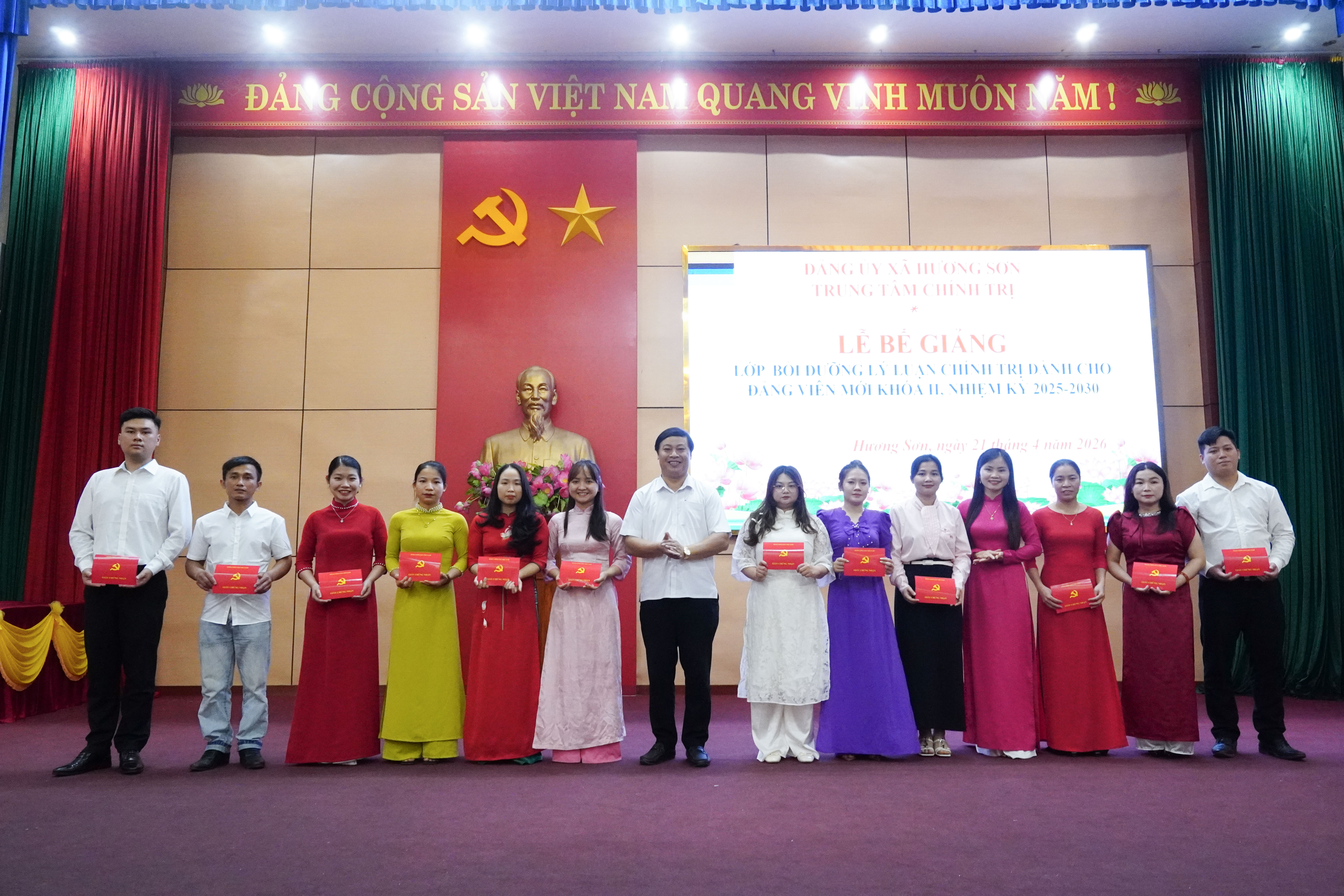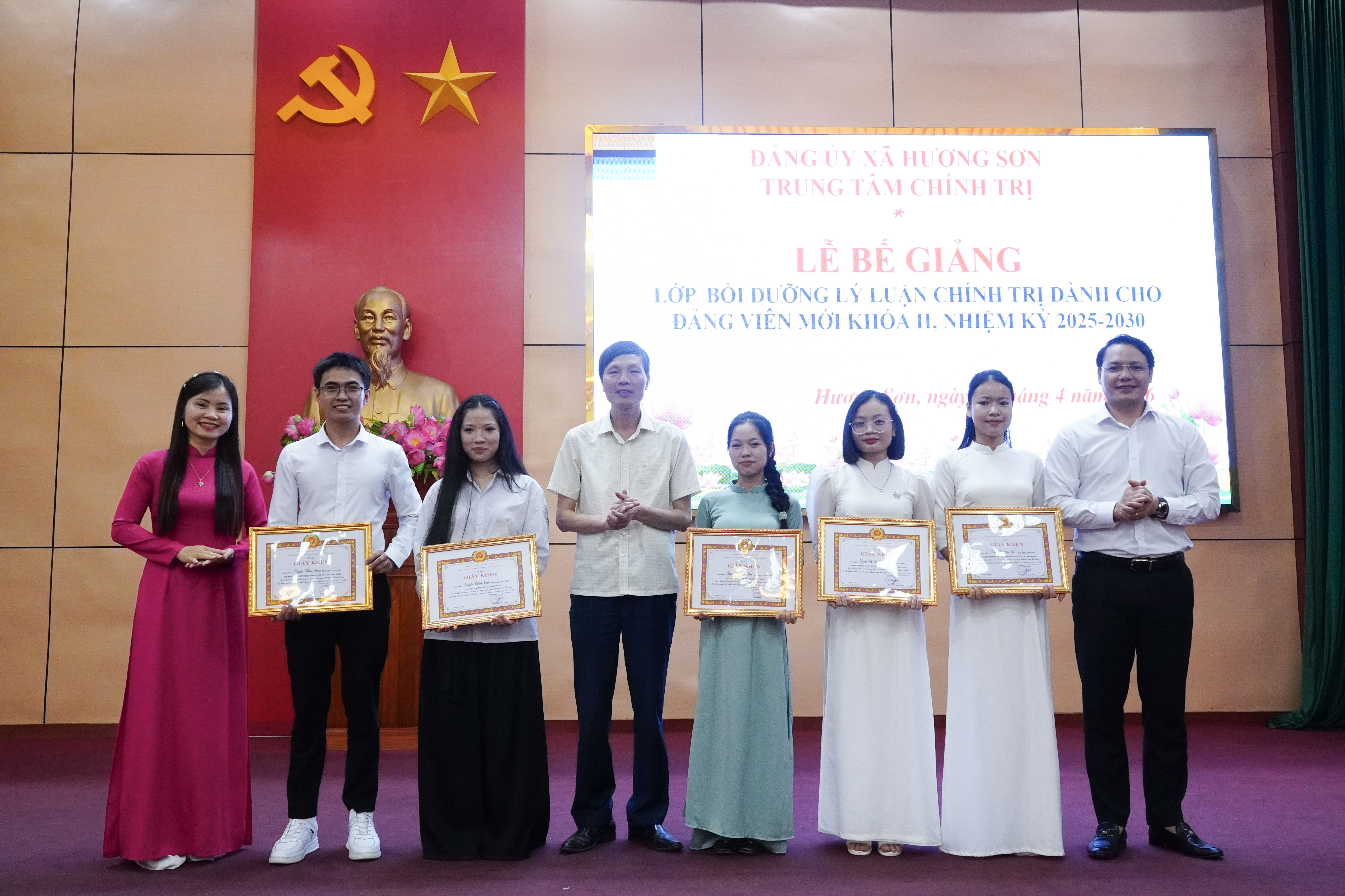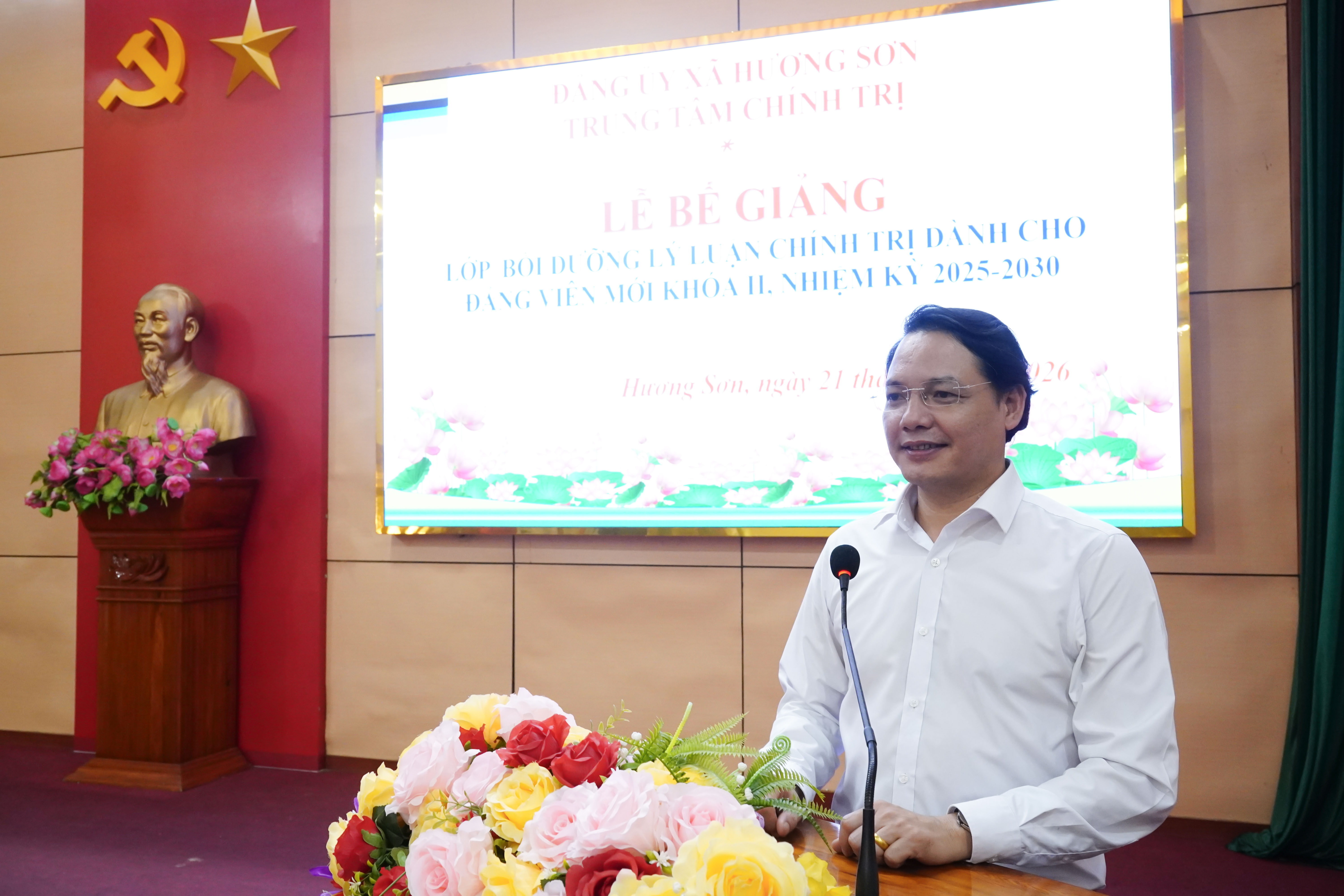 Phát biểu tại Lễ bế giảng đồng chí Trần Quang Thắng – Phó Bí thư TT Đảng ủy xã Hương Sơn ghi nhận và biểu dương tinh thần học tập nghiêm túc của các học viên; đồng thời đánh giá cao sự chuẩn bị chu đáo của Trung tâm Chính trị, sự tận tâm, trách nhiệm của đội ngũ giảng viên đã góp phần quan trọng vào thành công của khóa học. Sau khóa học đề nghị mỗi đồng chí học viên tiếp tục phát huy kết quả đã đạt được, không ngừng tự học, tự rèn luyện, vận dụng linh hoạt những kiến thức lý luận đã được trang bị vào thực tiễn công tác tại cơ quan, đơn vị, địa phương. Cần giữ vững bản lĩnh chính trị, phẩm chất đạo đức, lối sống, nêu cao tinh thần trách nhiệm, gương mẫu của người đảng viên.
