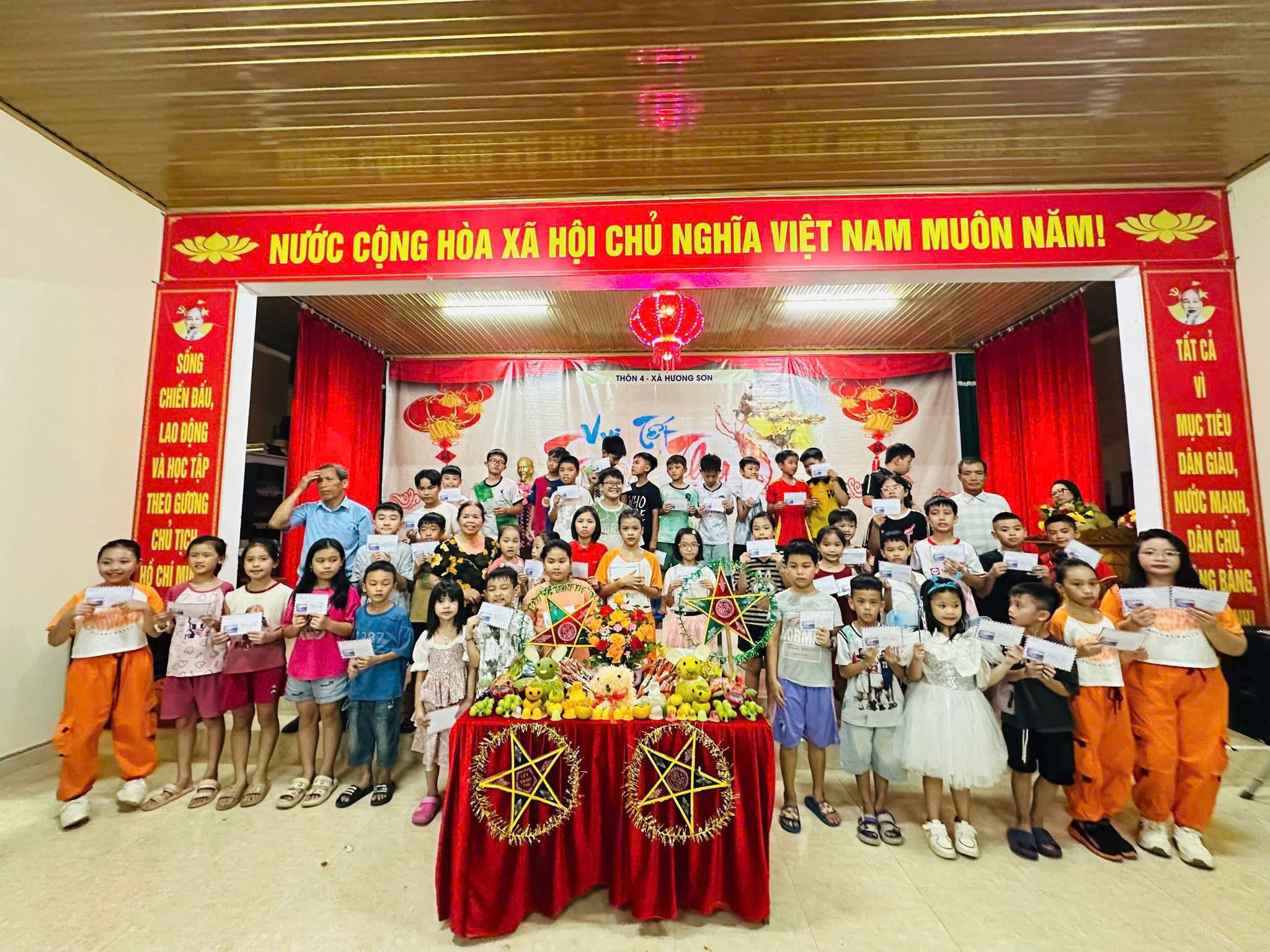 Trong dịp này, xã Hương Sơn đã tổ chức hỗ trợ 7.741 cháu thiếu nhi tại các thôn đón Tết Trung thu, đồng thời trực tiếp trao 91 suất quà đặc biệt cho các em có hoàn cảnh khó khăn. Tổng số tiền hỗ trợ cho các hoạt động ý nghĩa này lên tới gần 100 triệu đồng, được trích từ ngân sách của địa phương, khẳng định sự quan tâm sâu sắc nhằm đảm bảo mọi trẻ em đều được đón một mùa Trung thu trọn vẹn, ấm áp và hạnh phúc. Bên cạnh đó, các thôn, tổ chức cá nhân, đơn vị trên địa bàn sẽ tiếp tục thực hiện xã hội hoá các nguồn hỗ trợ để tổ chức nhiều hoạt động ý nghĩa cho thiếu nhi trên địa bàn.