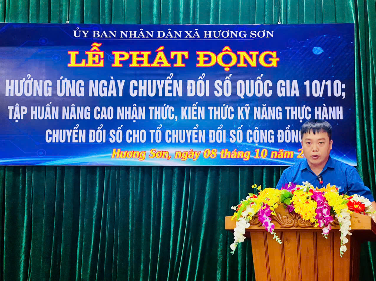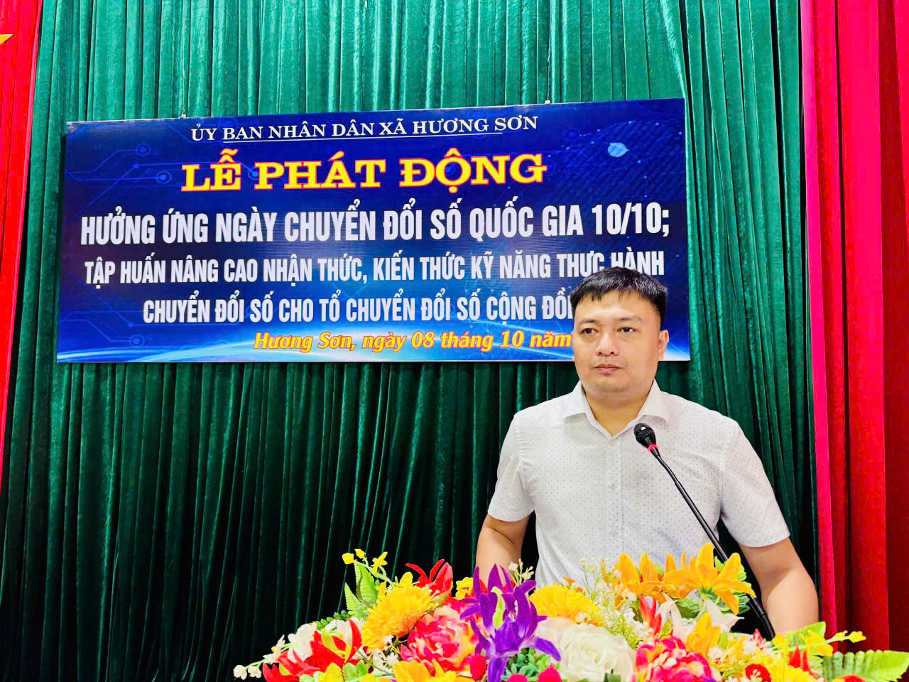 Phát biểu tại buổi lễ, đồng chí Nguyễn Tiến Thích – P. Chủ tịch UBND xã Hương Sơn nhấn mạnh: Chuyển đổi số là xu thế tất yếu, là giải pháp quan trọng góp phần nâng cao hiệu quả quản lý, điều hành của chính quyền, phát triển kinh tế - xã hội và phục vụ tốt hơn người dân, doanh nghiệp. Đồng chí kêu gọi toàn thể cán bộ, công chức, đoàn thể và người dân tích cực tham gia, hưởng ứng các hoạt động chuyển đổi số, cùng chung tay xây dựng xã Hương Sơn trở thành xã thông minh, hiện đại.