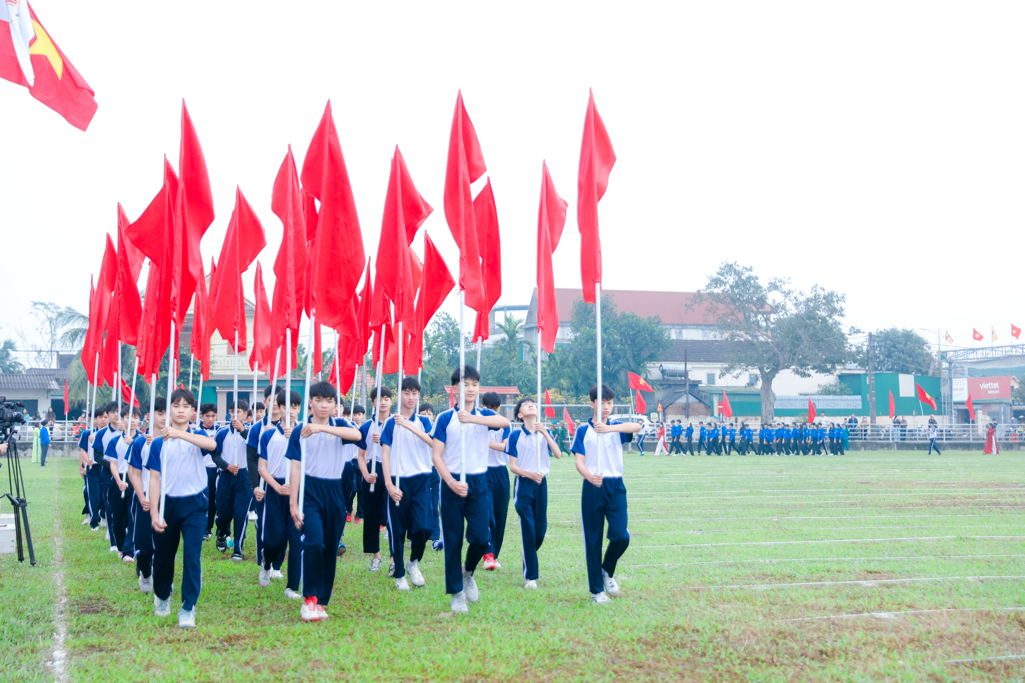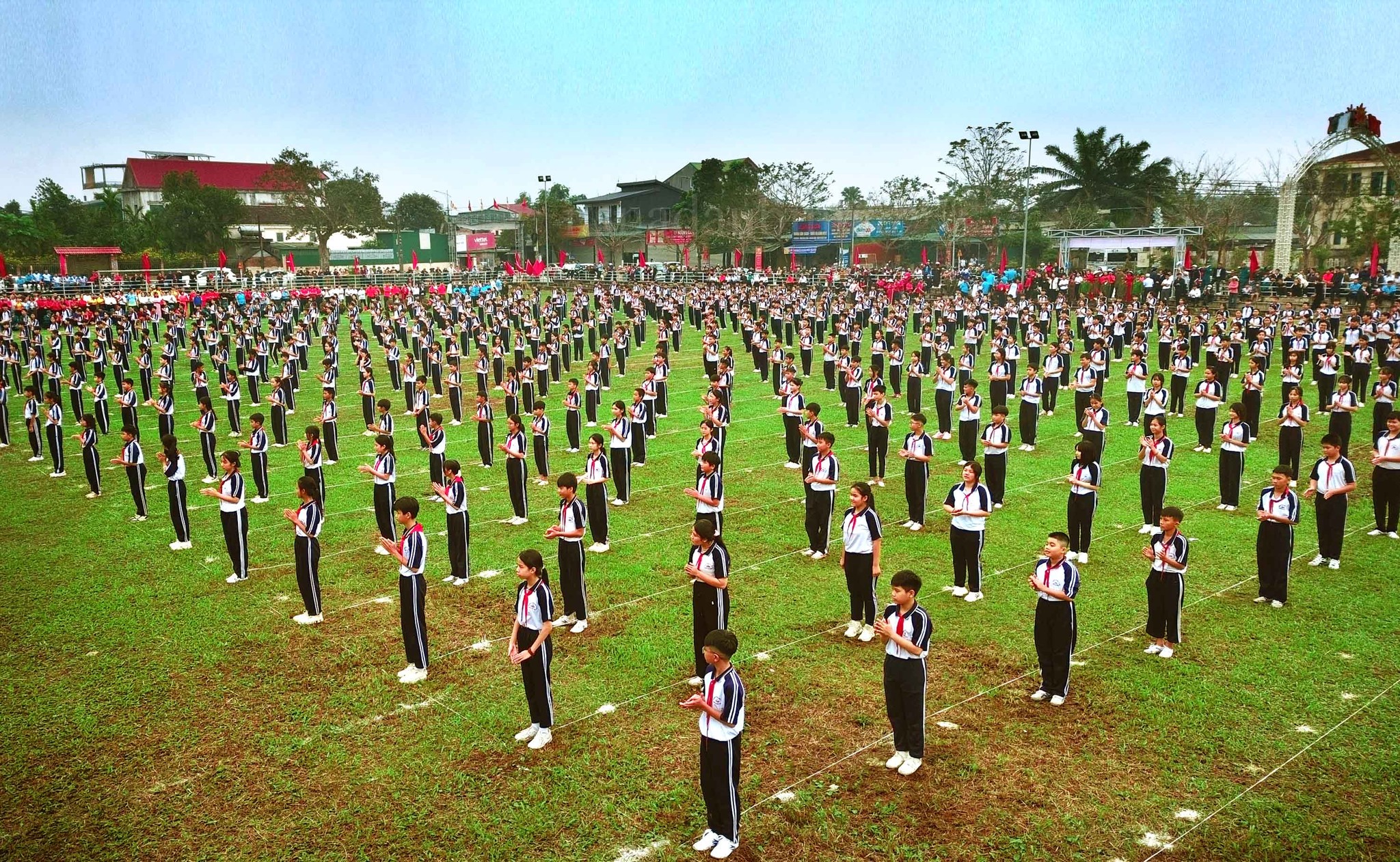 Tiếp nối chương trình là màn đồng diễn với sự tham gia của hàng trăm em học sinh đến từ Trường THCS Nguyễn Tuấn Thiện.
